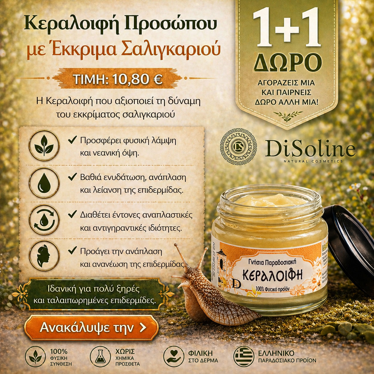 Η κεραλοιφή προσώπου με έκκριμα σαλιγκαριού ενισχύει την καθημερινή περιποίηση του δέρματος με έντονα αναπλαστικές και αντιγηραντικές ιδιότητες. Το έκκριμα σαλιγκαριού είναι πλούσιο σε κολλαγόνο, ελαστίνη, αλαντοΐνη και φυσικά οξέα, τα οποία βοηθούν στη βελτίωση της ελαστικότητας, στη μείωση λεπτών γραμμών και στην ανανέωση των κυττάρων.